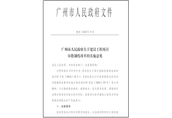 項目亮點 《廣州市建設工程項目審批制度改革的實施意見》已于2017年由廣州市政府印發實施。該文件落實中央有關文件精神,推進簡政放權,放管結合,優化服務改革。改善企業投資建設工程項目審批管理、強化政府投資建設工程項目全流程管理、推進審批體制機制改革創新。